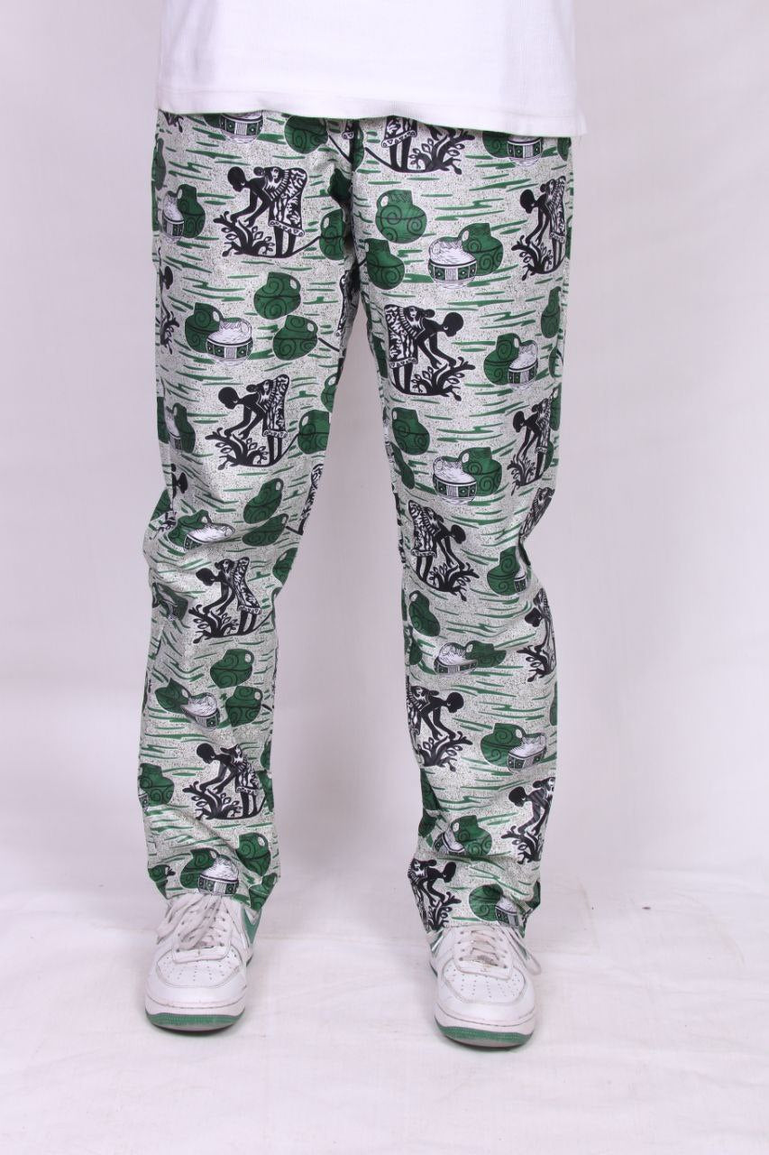 Oversized pants with two front pockets, one back pocket, an adjustable waistband with a drawstring, and a tag detail.